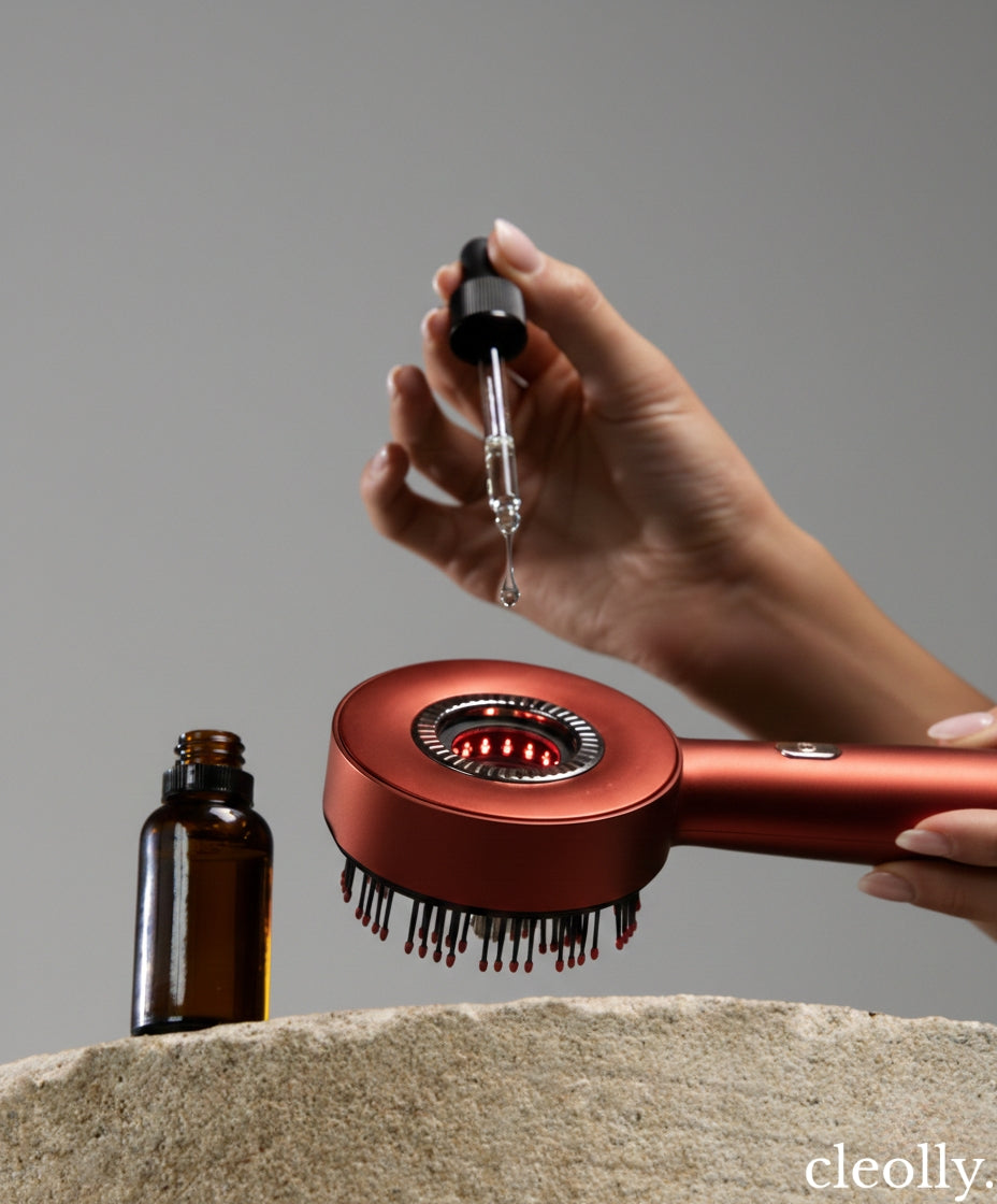 Technologia czerwonego światła LED (630 nm) wspiera krążenie, dotlenienie skóry głowy oraz regenerację cebulek włosów.